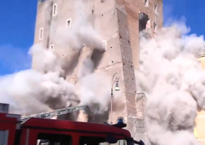 Soccorritori in azione per liberare l'operaio bloccato tra le macerie della Torre dei Conti, in parte crollata questa mattina intorno alle 11.20 nell'area dei Fori Imperiali a Roma. L’operaio bloccato è di nazionalità rumena. I vigili del fuoco del gruppo Saf, speleo-alpino-fluviale, sono al lavoro per raggiungerlo cercando di passare attraverso una piccola finestra posizionata sul lato sinistro della Torre. La torre è crollata mentre erano in corso lavori di ristrutturazione L'intervento dei vigili del fuoco, che hanno messo in salvo 4 operai, uno dei quali è stato ricoverato in condizioni gravi, è stato complicato da un altro crollo proprio mentre i pompieri stavano soccorrendo l’operaio rimasto bloccato. A cedere è stata un’ulteriore parte interna della struttura che attualmente è pericolante e potrebbe collassare completamente. I vigili del fuoco hanno immediatamente messo in sicurezza tutta l’area.La zona intorno a largo Corrado Ricci è completamente bloccata dalle forze dell’ordine, che hanno transennato l'area
