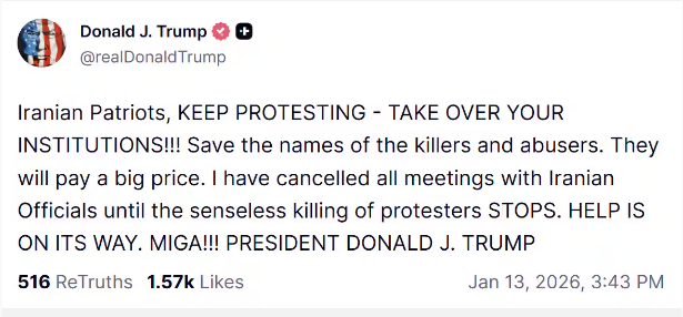 Trump agli iraniani: continuate a manifestare, l'aiuto è in arrivo. In preparazione un intervento militare Usa